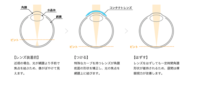このため日中は、通常のコンタクトレンズやメガネを使わず、裸眼で過ごすことができます。