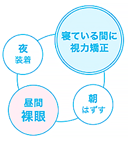 就寝前に、特殊なカーブが施されたレンズを装着することで、寝ている間に角膜を正常な状態に整える近視矯正治療です。